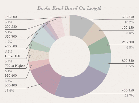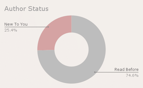 Au niveau parité, je suis pire que les années précédentes, puisque 77% des auteurs lus sont des autrices, contre 65/35 les années précédentes. On remarquera aussi qu’en majorité, mes lectures concernent des auteurices déjà lu.e.s. Vous le saviez aussi déjà, mais les pavés et moi, on est potes, puisque les livres entre 400 et 450 concernent 23.7% de mes lectures.